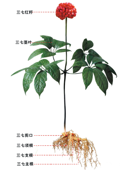 地下部分由三七剪口、三七主根、三七支根和三七须根组成。:主要含20(S)-原人参三醇型皂苷(Rg族皂苷),对中枢有兴奋作用,能提高脑力和体力活动,表现出抗疲劳等。