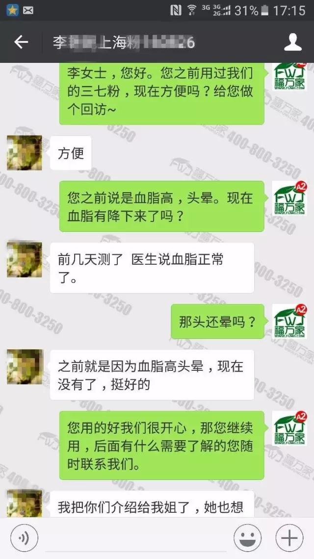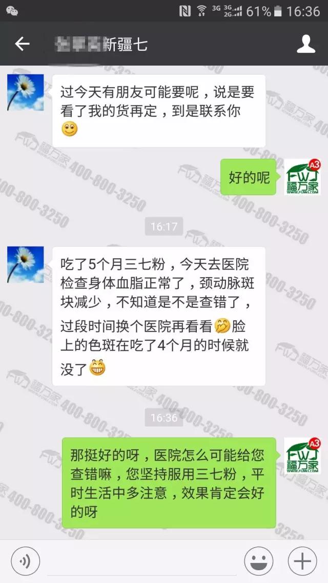 案例二:张女士,44岁,新疆人。她血脂比较高,劲动脉有斑块,在服用了5个多月的三七后,反馈说:血脂正常了,劲动脉斑块也减少了,更好的是脸上的色斑才吃三七粉4个月就消失了。