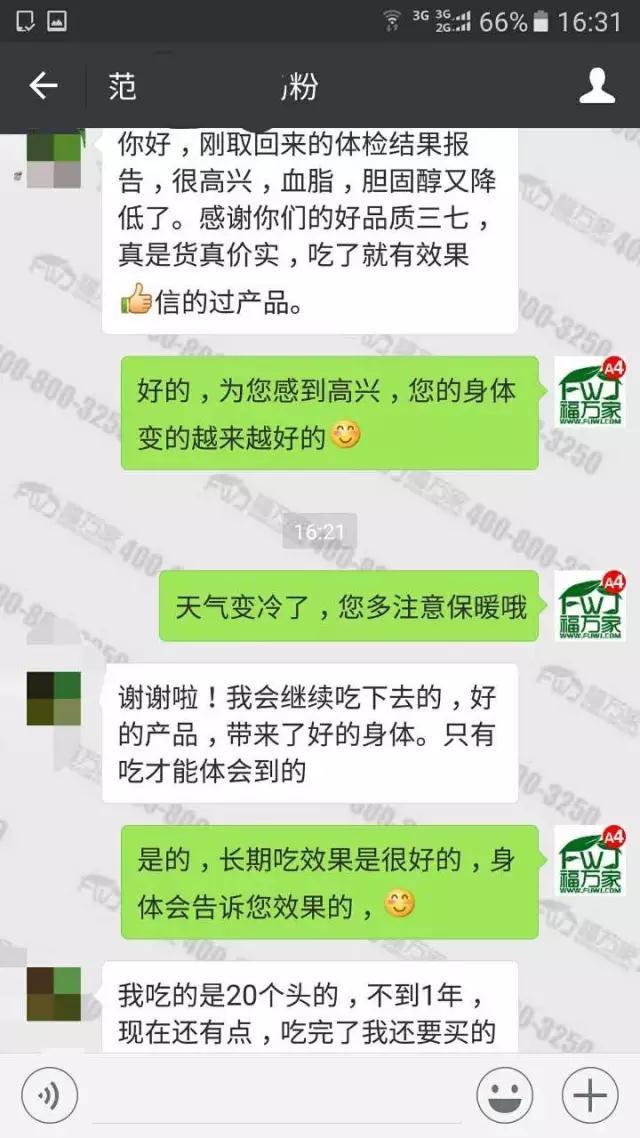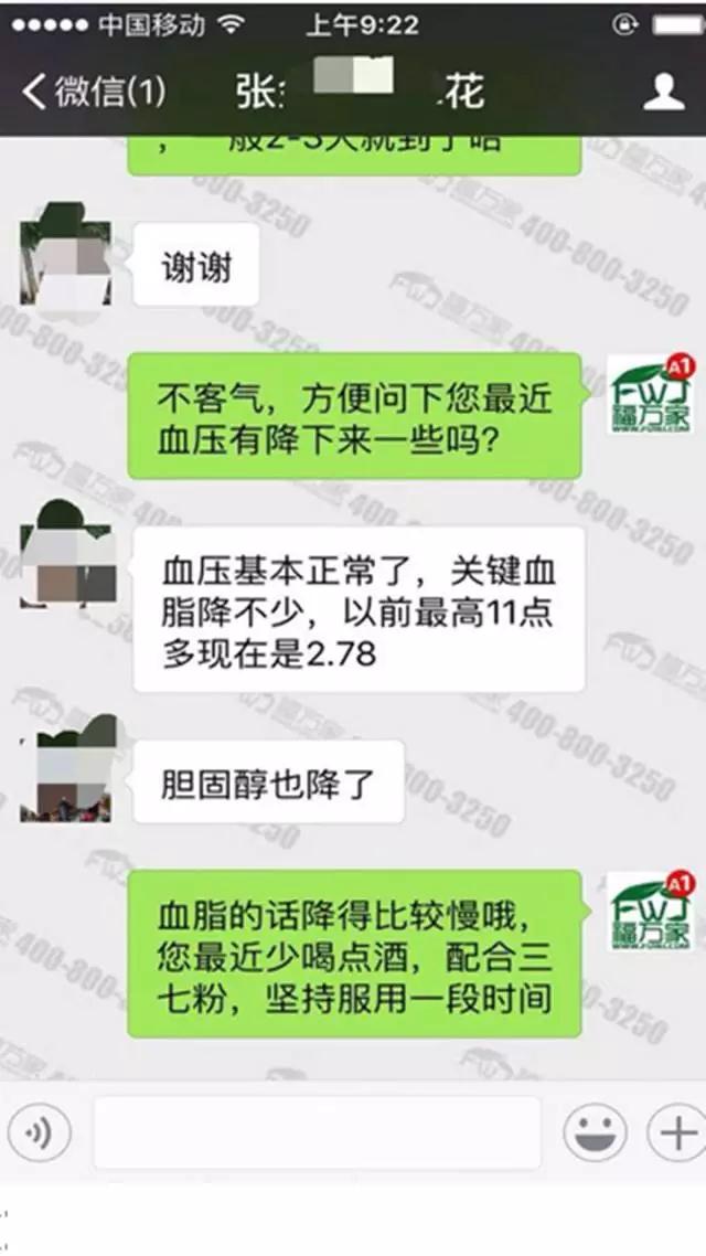 案例四:范女士,60岁,山东人。血脂和胆固醇都有点高,买了我们三七粉两次了,每天坚持用。吃了不到一年的时间里,反馈说:“刚体检回来,体检结果报告,很高兴,血脂、胆固醇又降低了”。